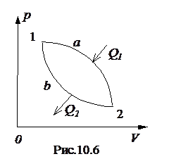 Важной технической задачей было получение механической энергии за счет тепловой. Машина, превращающая тепловую энергию в механическую, называется тепловой. Обычно работа тепловой машины связана с работой расширения газа. Однако, чтобы получать работу непрерывно, газ необходимо возвращать в исходное состояние. Для этого его необходимо сжимать при более низкой температуре. В общем случае на диаграмме p-V некоторыйгазовый процесс изобразится в виде цикла (рис.10.6). В результате процесса 1-a-2 газ получил некоторое количество тепла Q1 и совершил работу A12 . В процессе сжатия по линии 2- b -1 над газом совершается работа A21,и газ при этом отдает холодильнику количество тепла Q2. Обычно роль холодильника играет атмосферный воздух. Полная работа газового цикла A = A12 + A21 и равна его площади на диаграмме p-V. Так как внутренняя энергия газа не изменилась, то по первому началу термодинамики A = Q1 - Q2. Коэффициент полезного действия тепловой машины (КПД)