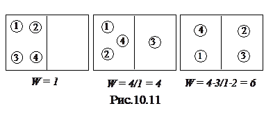 смену близких микроскопических состояний, отличающихся друг от друга распределением одних и тех же молекул в разных частях объема и распределением импульса между различными молекулами. Для примера рассмотрим распределение только четырех молекул по двум половинкам объема (рис.10.11). Первое макро-состояние, при котором в левой части объема находятся все молекулы, реализуется одним микросостоянием. Термодинамической вероятностью или статистическим весом W называют число микросостояний, с помощью которого реализуется данное макро-состояние. Первое макро-состояние имеет термодинамическую вероятность W= 1. Второе макро-состояние, при котором в левой части объема находятся три молекулы, а в правой - одна, реализуется четырьмя способами (в правой части можно по очереди разместить четыре различных молекулы), и его термодинамическая вероятность W = 4. Третье макро-состояние, при котором молекулы поровну распределены по половинкам объема, имеет термодинамическую вероятность W = 6. Точное определение того, что подразумевается под ”числом микроскопических способов осуществления” теплового состояния тела, дается в курсе статистической физики.