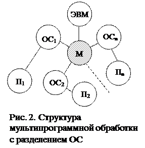 На рис. 1 изображена структура мультипрограммной обработки на одном компьютере без применения принципа виртуальной машины. Пользователи П 1, П 2, …, Пn имеют общую операционную систему ОС. Ошибка в ОС выводит из строя всех пользователей. На рис. 2 изображена структура системы с виртуальными машинами высокой степени изоляции. Только ошибка в сравнительно небольшой программе – мониторе М влечет за собой нарушение работы пользователей П 1, П 2, …, Пn. Отказы индивидуальных операционных систем ОС 1, ОС 2, …, ОСn вызывают нарушения в работе только «своего» пользователя.