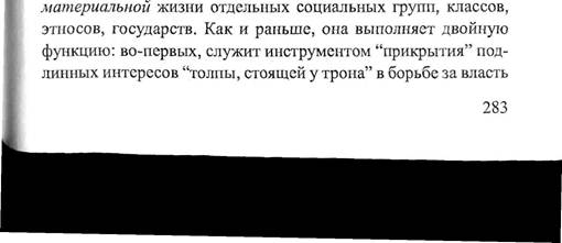 В чем же заключается подлинная ограниченность марксо-вой доктрины с точки зрения современной философской культуры? Как уже отмечалось, Маркс смотрел на исторический процесс "изнутри" социума, поэтому и получалось, что вся духовная жизнь человечества представала как "идеология" в широком смысле слова. Это касалось не только политических или правовых идей, но и "идейного содержания" произведений искусства, философских трактатов, религиозных учений, моральных норм и ценностей. Спору нет, в социуме все сферы духовного производства социальная верхушка и богатые слои населения пытаются использовать в корыстных интересах,