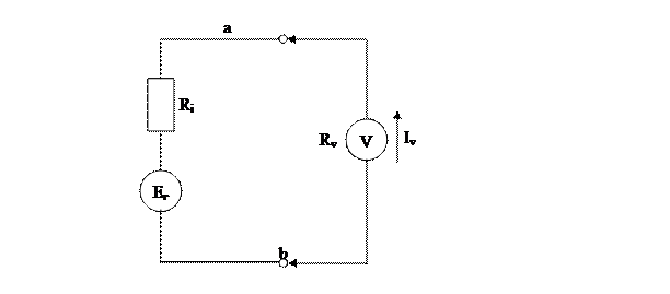 До подключения вольтметра напряжение между точками a и b электрической цепи будет равно Ег. После подключения вольтметра через него потечет ток Iv, определяемый его входным сопротивлением Rv, который создает падение напряжения на сопротивлении Ri.