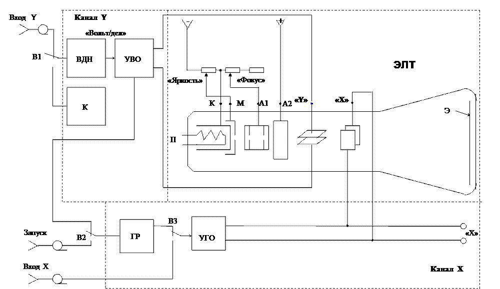Упрощенная структурная схема типового ЭО (рис.3.1) включает в себя электронно-лучевую трубку (ЭЛТ) и устройства управления лучом (канал Х и канал Y). Питание ЭЛТ и всех электронных узлов схемы осуществляется от встроенного источника стабилизированного напряжения (на схеме не показано).