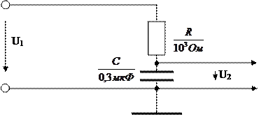Если напряжение U2 отстает по фазе от U1 на угол φ, то перед φ надо поставить знак минус. Такие напряжения для эксперимента можно получить с помощью RC - цепи, показанной на рисунке 3.4. Для нее φ = - arctgωRC = - arctg(2πfRC). Если 2πfRC = 1, то фазовый сдвиг будет равен π/4 т.е. 45о. При указанных на рис.3.4 значениях R и C примерно такой сдвиг по фазе будет при частоте напряжения U1, равной 50 Гц.