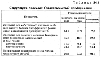 Чем выше уровень первого показателя и ниже второго и третьего, тем устойчивее ФСП. В нашем примере (табл. 24.1) доля собственного капитала имеет тенденцию к понижению. За отчетный год она снизилась на 2,8 %, так как темпы прироста собственного капитала ниже темпов прироста заемного. Плечо финансового рычага увеличилось на 10 %. Это свидетельствует о том, что финансовая зависимость предприятия от внешних инвесторов значительно повысилась.