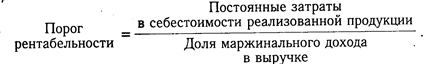 Порог рентабельности — отношение суммы постоянных затрат в составе себестоимости реализованной продукции к доле маржинального дохода в выручке: