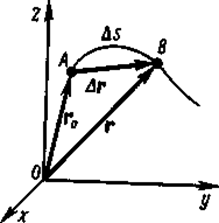 Рассмотрим движение материальной точки вдоль произвольной траектории (рис. 2). Отсчет времени начнем с момента, когда точка находилась в положении А. Длина участка траектории АВ, пройденного материальной точкой с момента начала отсчета времени, называется длиной пути aj и является скалярной функцией времени: Ds = Ds(t). Вектор Dr = r – r0, проведенный из начального положения движущейся точки в положение ее в данный момент времени (приращение радиуса-вектора точки за рассматриваемый промежуток времени), называется перемещением.