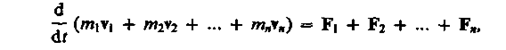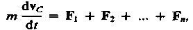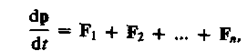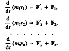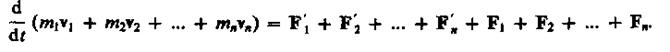 Рассмотрим механическую систему, состоящую из n тел, масса и скорость которых соответственно равны m1, m2,…, mnи v1, v2,…, vn. Пусть F¢1, F¢2,..., F¢n — равнодействующие внутренних сил, действующих на каждое из этих тел, a F1, F2,..., Fn — равнодействующие внешних сил. Запишем второй закон Ньютона для каждого из л тел (механической системы: