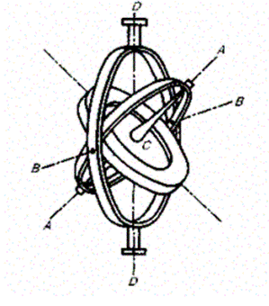 Рассмотрим одну из разновидностей гироскопов — гироскоп на кардановом подвесе (рис. 32). Дискообразное тело — гироскоп — закреплено на оси АА, которая может вращаться вокруг перпендикулярной ей горизонтальной оси ВВ, которая, в свою очередь, может поворачиваться вокруг вертикальной оси DD. Все три оси пересекаются в одной точке С, являющейся центром масс гироскопа и остающейся неподвижной, а ось гироскопа может принять любое направление в пространстве. Силами трения в подшипниках всех трех осей и моментом импульса колец пренебрегаем.
