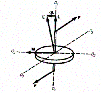 Гироскопический эффект объясняется следующим образом. Момент М пары сил F направлен вдоль прямой О2О2.За время dt момент импульса L гироскопа получит приращение dL = Mdt (направление dL совпадает с направлением М) и станет равным L' = L + dL. Направление вектора L' совпадает с новым направлением оси вращения гироскопа. Таким образом, ось вращения гироскопа повернется вокруг прямой О3О3. Если время действия силы мало, то, хотя момент сил М и велик, изменение момента импульса dL гироскопа будет также весьма малым. Поэтому кратковременное действие сил практически не приводит к изменению ориентации оси вращения гироскопа в пространстве. Для ее изменения следует прикладывать силы в течение длительного времени.
