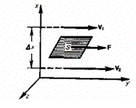 Сила внутреннего трения F тем больше, чем больше рассматриваемая площадь поверхности слоя S (рис. 52), и зависит от того, насколько быстро меняется скорость течения жидкости при переходе от слоя к слою. На рисунке представлены два слоя, отстоящие друг от друга на расстоянии Dх и движущиеся со скоростями v1 и v2. При этом v1— v2 = Dv. Направление, в котором отсчитывается расстояние между слоями, перпендикулярно скорости течения слоев. Величина — показывает, как быстро меняется скорость при переходе от слоя к слою в направлении х, перпендикулярном направлению движения слоев, и называется градиентом скорости. Таким образом, модуль силы внутреннего трения