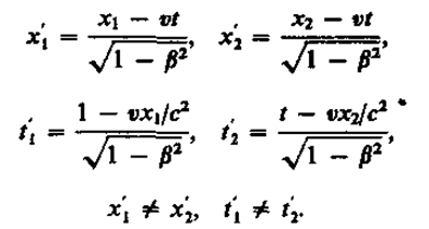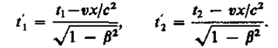 Если события в системе К пространственно разобщены (х1 ¹ x2), но одновременны (t1 = t2), то в системе К', согласно преобразованиям Лоренца (36.3),