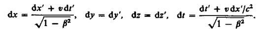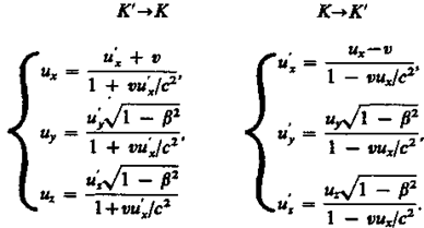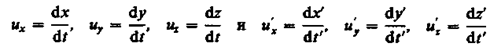 представляют собой соответственно проекции на оси х, у, z и х', у', z' вектора скорости рассматриваемой точки относительно систем К и К'. Согласно преобразованиям Лоренца (36.3),