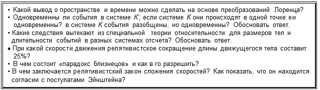 1. Одновременность событий в разных системах отсчета. Пусть в системе К в точках с координатами х1и х2в моменты времени t1и t2 происходят два события. В системе К' им соответствуют координаты х¢1 и х'2и моменты времени t'1, и t¢2. Если события в системе К происходят в одной точке (x1 = x2) и являются одновременными (t1 = t2), то, согласно преобразованиям Лоренца (36.3),
