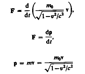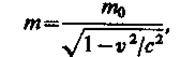 где т0 — масса покоя частицы, т. е. масса, измеренная в той инерциальной системе отсчета, относительно которой частица находится в покое; с — скорость света в вакууме; т — масса частицы в системе отсчета, относительно которой она движется со скоростью v. Следовательно, масса одной и той же частицы различна в разных инерциальных системах отсчета.