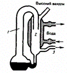 Для получения высокого вакуума применяются диффузионные насосы (рабочее вещество — ртуть или масло), которые не способны откачивать газ из сосудов начиная с атмосферного давления, но способны создавать добавочную разность давлений, поэтому их употребляют вместе с форвакуумными насосами. Рассмотрим схему действия диффузионного насоса (рис. 73). В колбе ртуть нагревается, пары ртути, поднимаясь по трубке 1, вырываются из сопла 2 с большой скоростью, увлекая за собой молекулы газа из откачиваемого сосуда (в нем создан предварительный вакуум). Эти пары, попадая затем в «водяную рубашку», конденсируются и стекают обратно в резервуар, а захваченный газ выходит в пространство (через трубку 3), в котором уже создан форвакуум. Если применять многоступенчатые насосы (несколько сопл расположены последовательно), то реально при хороших уплотнениях можно с помощью них получить разрежение до 10-7 мм рт. ст.