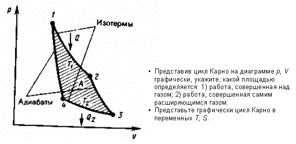 Карно теоретически проанализировал обратимый наиболее экономичный цикл, состоящий из двух изотерм и двух адиабат. Его называют циклом Карно. Рассмотрим прямой цикл Карно, в котором в качестве рабочего тела используется идеальный газ, заключенный в сосуд с подвижным поршнем.