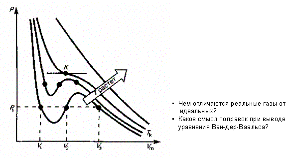 Эта изотерма называется критической, соответствующая ей температура Tk — критической температурой; точка перегиба К называется критической точкой; в этой точке касательная к ней параллельна оси абсцисс. Соответствующие этой точке объем Кк и давление ркназываются также критическими. Состояние с критическими параметрами (pk, Vk, Tk) называется критическим состоянием. При низких температурах (Т <Tk) изотермы имеют волнообразный участок, сначала монотонно опускаясь вниз, затем монотонно поднимаясь вверх и снова монотонно опускаясь.