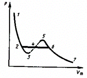 Рассматривая различные участки изотермы при Т < ТК(рис. 90), видим, что на участках 1— 3 и 5—7 при уменьшении объема Vm давление р возрастает, что естественно. На участке 3 —5 сжатие вещества приводит к уменьшению давления; практика же показывает, что такие состояния в природе не осуществляются. Наличие участка 3 —5 означает, что при постепенном изменении объема вещество не может оставаться все время в виде однородной среды; в некоторый момент должно наступить скачкообразное изменение состояния и распад вещества на две фазы. Таким образом, истинная изотерма будет иметь вид ломаной линии 7—6—2—1, Часть 6 —7 отвечает газообразному состоянию, а часть 2—1 — жидкому. В состояниях, соответствующих горизонтальному участку изотермы 6 — 2, наблюдается равновесие жидкой и газообразной фаз вещества. Вещество в газообразном состоянии при температуре ниже критической называется паром, а пар, находящийся в равновесии со своей жидкостью, называется насыщенным.