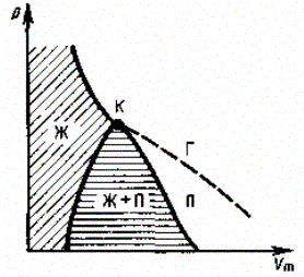 Если через крайние точки горизонтальных участков семейства изотерм провести линию, то получится колоколообразная кривая (рис. 91), ограничивающая область двухфазных состояний вещества. Эта кривая и критическая изотерма делят диаграмму р, Vmпод изотермой на три области: под колоколообразной кривой располагается область двухфазных состояний (жидкость и насыщенный пар), слева от нее находится область жидкого состояния, а справа — область пара. Пар отличается от остальных газообразных состояний тем, что при изотермическом сжатии претерпевает процесс сжижения. Газ же при температуре выше критической не может быть превращен в жидкость ни при каком давлении.