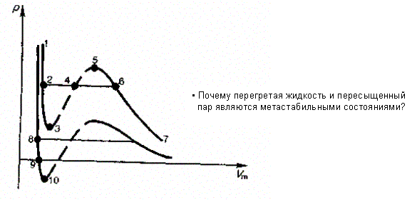 Сравнивая изотерму Ван-дер-Ваальса с изотермой Эндрюса (верхняя кривая на рис. 92), видим, что последняя имеет прямолинейный участок 2— 6, соответствующий двухфазным состояниям вещества. Правда, при некоторых условиях могут быть реализованы состояния, изображаемые участками ван-дер-ваальсовой изотермы 5— 6 и 2— 3. Эти неустойчивые состояния называются метастабнльнымн. Участок 2—3 изображает перегретую жидкость, 5—6 — пересыщенный пар. Обе фазы ограниченно устойчивы.