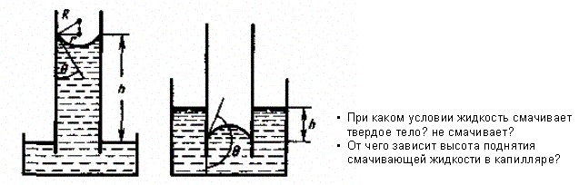 Если поместить узкую трубку (капилляр) одним концом в жидкость, налитую в широкий сосуд, то вследствие смачивания или несмачивания жидкостью стенок капилляра кривизна поверхности жидкости в капилляре становится значительной. Если жидкость смачивает материал трубки, то внутри ее поверхность жидкости — мениск — имеет вогнутую форму, если не смачивает — выпуклую (рис. 101).