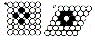 Расположение атомов в кристаллах характеризуется также координационным числом — числом ближайших однотипных с данным атомом соседних атомов в кристаллической решетке или молекул в молекулярных кристаллах. Для модельного изображения кристаллических структур из атомов и ионов пользуются системой плотной упаковки шаров. Рассматривая простейший случай плотной упаковки шаров одинакового радиуса на плоскости, приходим к двум способам их расположения (рис. 106, а, б). Правая упаковка является более плотной, так как при равном числе шаров площадь ромба со стороной, равной стороне квадрата, меньше площади квадрата. Как видно из рисунка, различие в упаковках сводится к различию координационных чисел: в левой упаковке координационное число равно 4, в правой — 6, т. е. чем плотнее упаковка, тем больше координационное число.