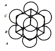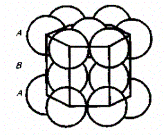 Из множества возможных комбинаций в кристаллографии реальное значение имеют два типа упаковки: 1) двухслойная упаковка АВАВАВ... —- гексагональная плотно-упакованная структура (рис. 108); 2) трехслойная упаковка ABC ABC... — кубическая гранецентрированная структура (рис. 109). В обеих решетках координационное число равно 12 и плотность упаковки одинакова — атомы занимают 74% общего объема кристалла. Координационное число, соответствующее кубической объемно центрированной решетке, равно 8, решетке алмаза (см. рис. 104) равно 4.