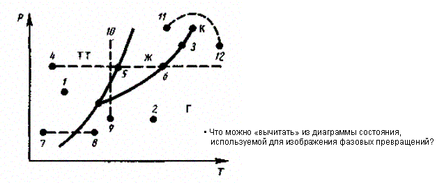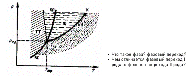 Для наглядного изображения фазовых превращений используется диаграмма состояния (рис. 115), на которой В координатах р, Тзадается зависимость между температурой фазового перехода и давлением в виде кривых испарения (КИ), плавления (КП) и сублимации (КС), разделяющих поле диаграммы на три области, соответствующие условиям существования твердой (ТТ), жидкой (Ж) и газообразной (Г) фаз. Кривые на диаграмме называются кривыми фазового равновесия, каждая точка на них соответствует условиям равновесия двух сосуществующих фаз: КП — твердого тела и жидкости, КИ — жидкости и газа, КС — твердого тела и газа.