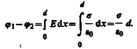 2. Поле двух бесконечных параллельных разноименно заряженных плоскостей определяется формулой (8X2): Е = s/e0, где s — поверхностная плотность заряда. Разность потенциалов между плоскостями, расстояние между которыми равно d (см. формулу (85.1)), равна