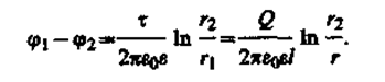 Для определения емкости цилиндрического конденсатора, состоящего из двух полых коаксиальных цилиндров срадиусами r1и r2 (r2 > r1), вставленных один в другой, опять пренебрегая краевыми эффектами, считаем поле радиально-симметричным и сосредоточенным между цилиндрическими обкладками. Разность потенциалов между обкладками вычислим по формуле (86.3) для поля равномерно заряженного бесконечного цилиндра с линейной плотностью r=Q/l(l— длина обкладок). При наличии диэлектрика между обкладками разность потенциалов