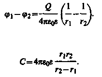 Для определения емкости сферического конденсатора, состоящего из двух концентрических обкладок, разделенных сферическим слоем диэлектрика, используем формулу (86.2) для разности потенциалов между двумя точками, лежащими на расстояниях r1и r2 (r2 > r1) от центра заряженной сферической поверхности. При наличии диэлектрика между обкладками разность потенциалов