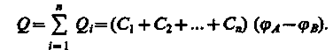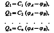 У параллельно соединенных конденсаторов разность потенциалов на обкладках конденсаторов одинакова и равна jA - jB.Если емкости отдельных конденсаторов С1, С2,..., Сn,то, согласно (94.1), их заряды равны