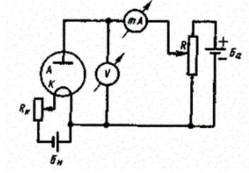 Исследование закономерностей термоэлектронной эмиссии можно провести с по мощью простейшей двухэлектродной лампы — вакуумного диода, представляющего собой откачанный баллон, содержащий два электрода: катод К и анод А. В простейшем случае катодом служит нить из тугоплавкого металла (например, вольфрама), накаливаемая электрическим током. Анод чаще всего имеет форму металлического цилиндра, окружающего катод. Если диод включить в цепь, как это показано на рис. 152, то при накаливании катода и подаче на анод положительного напряжения (относительно катода) в анодной цепи диода возникает ток. Если поменять полярность батареи БЛ) то ток прекращается, как бы сильно катод ни накаливали. Следовательно, катод испускает отрицательные частицы — электроны.