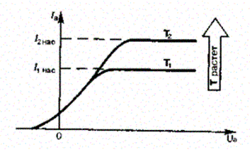На рис. 153 представлены вольт-амперные характеристики для двух температур катода: T1и T2причем Т2 > Т1.С повышением температуры катода испускание электронов с катода интенсивнее, при этом увеличивается и ток насыщения. При Uа=0 наблюдается анодный ток, т. е. некоторые электроны, эмиттируемые катодом, обладают энергией, достаточной для преодоления работы выхода и достижения анода без приложения электрического поля.