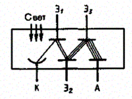 Явление вторичной электронной эмиссии используется в фотоэлектронных умножителях (ФЭУ), применяемых для усиления слабых электрических токов. ФЭУ представляет собой вакуумную трубку с фотокатодом К и анодом А, между которыми расположено несколько электродов — эмиттеров (рис. 155). Электроны, вырванные из фотокатода под действием света, попадают на эмиттер Э1 пройдя ускоряющую разность потенциалов между К и Э1. Из эмиттера Э1 выбивается dэлектронов. Усиленный таким образом электронный поток направляется на эмиттер Э2, и процесс умножения повторяется на всех последующих эмиттерах. Если ФЭУ содержит nэмиттеров, то на аноде А, называемом коллектором, получается усиленный в dn раз фотоэлектронный ток.