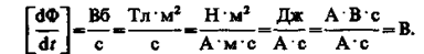 Закон Фарадея можно сформулировать еще таким образом: э.д.с. Е, электромагнитной индукции в контуре численно равна и противоположна по знаку скорости изменения магнитного потока сквозь поверхность, ограниченную этим контуром. Этот закон является универсальным: э. д. с. Б, не зависит от способа изменения магнитного потока. Э.д.с. электромагнитной индукции выражается в вольтах. Действительно, учитывая, что единицей магнитного потока является вебер (Вб), получим