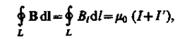 где I и I' — соответственно алгебраические суммы макротоков (токов проводимости) и микротоков (молекулярных токов), охватываемых произвольным замкнутым кон туром L. Таким образом, циркуляция вектора магнитной индукции В по произвольному замкнутому контуру равна алгебраической сумме токов проводимости и молекулярных токов, охватываемых этим контуром, умноженной на магнитную постоянную. Вектор В, таким образом, характеризует результирующее поле, созданное как макроскопическими токами в проводниках (токами проводимости), так и микроскопическими токами в магнетиках, поэтому линии вектора магнитной индукции В не имеют источников и являются замкнутыми.