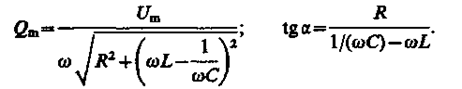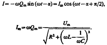 Продифференцировав Q = Qmcos(wt - a) no t, найдем силу тока в контуре при установившихся колебаниях: