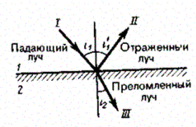 Закон отражения: отраженный луч лежит в одной плоскости с падающим лучом и перпендикуляром, проведенным к границе раздела двух сред в точке падения; угол i'1, отражения равен углу i1 падения: