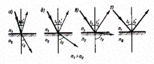Отсюда следует, что преломленный луч удаляется от нормали и угол преломления i2 больше, чем угол падения i1(рис. 230, а). С увеличением угла падения увеличивается угол преломления (рис. 230, б, в) до тех пор, пока при некотором угле падения (i1 = iпр,) угол преломления не окажется равным p/2. Угол iпр называется предельным углом. При углах падения i1 > iпр весь падающий свет полностью отражается (рис. 230, г).