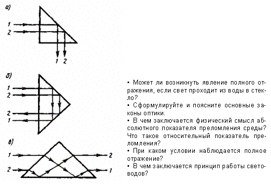 Явление полного отражения используется в призмах полного отражения. Показатель преломления стекла равен n»1,5, поэтому предельный угол для границы стекло — воздух равен iпр =arcsin(l/l,5) = 42°. Поэтому при падении света на границу стекло — воздух при i > 42° всегда будет иметь место полное отражение. На рис. 231, а — в показаны призмы полного отражения, позволяющие: а) повернуть луч на 90°; б) повернуть изображение; в) обернуть лучи. Такие призмы применяются в оптических приборах (например, в биноклях, перископах), а также в рефрактометрах, позволяющих определять показатели преломления тел (по закону преломления, измеряя iпр, находим относительный показатель преломления двух сред, а также абсолютный показатель преломления одной из сред, если показатель преломления другой среды известен).