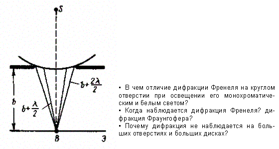 1. Дифракция на круглом отверстии. Сферическая волна, распространяющаяся из точечного источника S, встречает на своем пути экран с круглым отверстием. Дифракционную картину наблюдаем на экране Э в точке В, лежащей на линии, соединяющей S с центром отверстия (рис. 259).