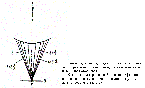 Экран параллелен плоскости отверстия и находится от него на расстоянии b. Разобьем открытую часть волновой поверхности Ф на зоны Френеля. Вид дифракционной картины зависит от числа зон Френеля, открываемых отверстием. Амплитуда результирующего колебания, возбуждаемого в точке В всеми зонами (см. (177.1) и (177.6)),