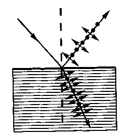 Если естественный свет падает на границу раздела двух диэлектриков (например, воздуха и стекла), то часть его отражается, а часть преломляется и распространяется во второй среде. Устанавливая на пути отраженного и преломленного лучей анализатор (например, турмалин), убеждаемся в том, что отраженный и преломленный лучи частично поляризованы: при поворачивании анализатора вокруг лучей интенсивность света периодически усиливается и ослабевает (полного гашения не наблюдается!). Дальнейшие исследования показали, что в отраженном луче преобладают колебания, перпендикулярные плоскости падения (на рис. 275 они обозначены точками), в прелом ленном — колебания, параллельные плоскости падения (изображены стрелками).