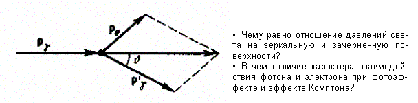 Как эффект Комптона, так и фотоэффект на основе квантовых представлении обусловлены взаимодействием фотонов с электронами. В первом случае фотон рассеивается, во втором — поглощается. Рассеяние происходит при взаимодействии фотона со свободным электроном, а фотоэффект — со связанными электронами. Можно показать что при столкновении фотона со свободным электроном не может произойти поглощения фотона, так как это находится в противоречии с законами сохранения импульса и энергии. Поэтому при взаимодействии фотонов со свободными электрона-ми может наблюдаться только их рассеяние, т. е. эффект Комптона.