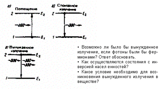 Испущенные фотоны, двигаясь в одном направлении и встречая другие возбужденные атомы, стимулируют дальнейшие индуцированные переходы, и число фотонов растет лавинообразно. Однако наряду с вынужденным излучением возможен и конкурирующий процесс — поглощение. Поэтому для усиления падающего излучения необходимо, чтобы число актов вынужденного излучения фотонов (оно пропорционально заселенности возбужденных состояний) превышало число актов поглощения фотонов (оно пропорционально заселенности основных состояний). В системе атомов, находящейся в термодинамическом равновесии, поглощение падающего излучения будет преобладать над вынужденным, т.е. падающее излучение при прохождении через вещество будет ослабляться.