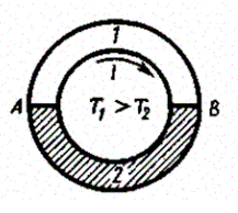 Рассмотрим замкнутую цепь, состоящую из двух металлических проводников 1 и 2 стемпературами спаев Т1(контакт А) и Т2 (контакт В),причем Т1 > Т2 (рис. 331).