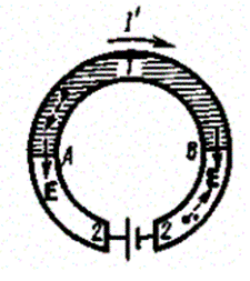Рассмотрим замкнутую цепь, состоящую из двух разнородных металлических проводников 1 и 2(рис. 332), по которым пропускается ток I' (его направление в данном случае выбрано совпадающим с направлением термотока (на рис. 331 при условии T1 > T2)). Согласно наблюдениям Пельтье, спай А, который при явлении Зеебека поддерживался бы при более высокой температуре, будет теперь охлаждаться, а спай В — нагреваться. При изменении направления тока I' спай А будет нагреваться, спай В — охлаждаться.
