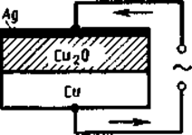 Принципиальная схема плоскостного меднозакисного (купроксного) выпрямителя дана на рис. 340. На медную пластину с помощью химической обработки наращивается слой закиси меди Сu2О, который покрывается слоем серебра. Серебряный электрод служит только для включения выпрямителя в цепь. Часть слоя Cu2O, прилегающая к меди и обогащенная ею, обладает электронной проводимостью, а часть слоя Сu2О, прилегающая к Ag и обогащенная (в процессе изготовления выпрямителя) кислородом, — дырочной проводимостью. Таким образом, в толще закиси меди образуется запирающий слой с пропускным направлением тока от Сu2О к Сu (р®n).