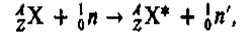 где вылетающий из ядра нейтрон обозначен как 10n', поскольку это не тот нейтрон, который проник в ядро; 10n' имеет энергию, меньшую энергии 10n, а остающееся после вылета нейтрона ядро находится в возбужденном состоянии (отмечено звездочкой), поэтому его переход в нормальное состояние сопровождается испусканием g-кванта.